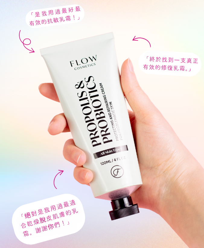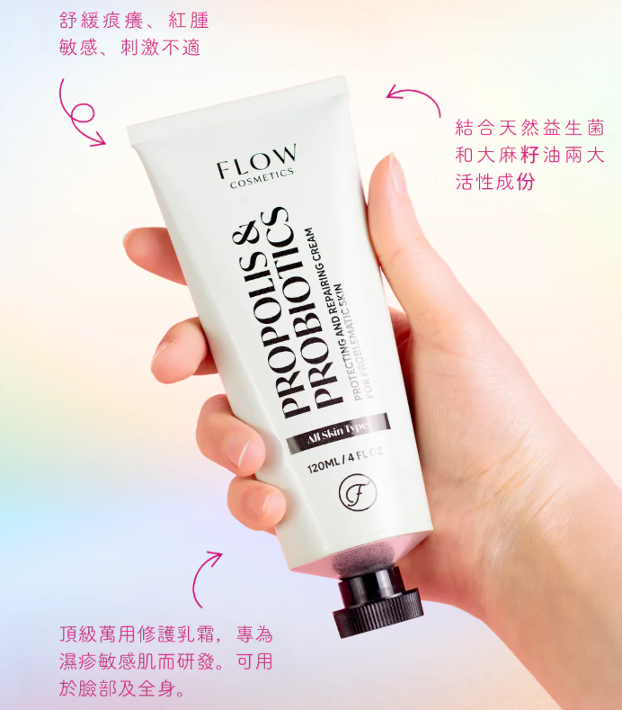 您是否一直在尋找一款能夠舒緩、修復並提升肌膚健康的護膚品?那麼不要再猶豫了!全新 FLOW COSMETICS 蜂膠益生菌抗敏止痕修復霜將會是您的「問題肌救星」。經過多年研發,這支芬蘭製的天然萬用修復霜終於誕生了。針對各類肌膚過敏問題,以大自然的天然療癒力量,絕無藥性,讓您不用再依賴類固醇,也可以好好舒緩及修復問題肌膚如紅疹、濕疹、敏感刺激、乾燥、痕癢、異位性皮膚炎(俗稱「濕疹」)和銀屑病(俗稱「牛皮癬」)等引起的皮膚不適。