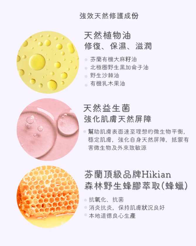 • 芬蘭頂級野生蜂蜜品牌 Hikiän 蜂膠萃取(蜂蠟): 來自北極圈森林的野生蜂膠萃取,集抗氧化、抗菌、消炎一身,保持肌膚狀況良好。芬蘭本地道德良心生產。